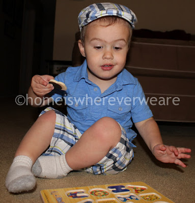 I got the pink baskets from Michaels, and the drawer pulls are Olive Kids. Her coming home from the hospital outfit (laid out on changing table) has an elephant on it just like her big brother's did! :) But E's pants have a ruffle butt!